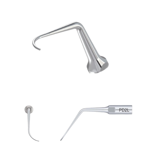Периодонтическая насадка для скалера PD2L имеет левоугловую форму, с которой удобно обрабатывать межзубные промежутки и труднодоступные места. Она предназначается для очистки поверхности и удаления зубного налета.
