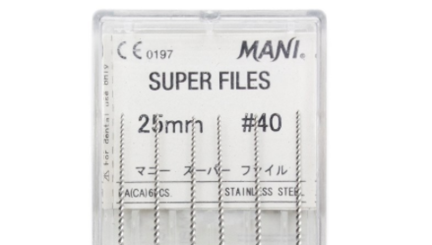 Супер файлы № 40 Mani применяются для очистки зубных каналов при лечении сложных случаев кариеса. Благодаря гибкости рабочей части их используют для работы с сильно искривленными каналами.